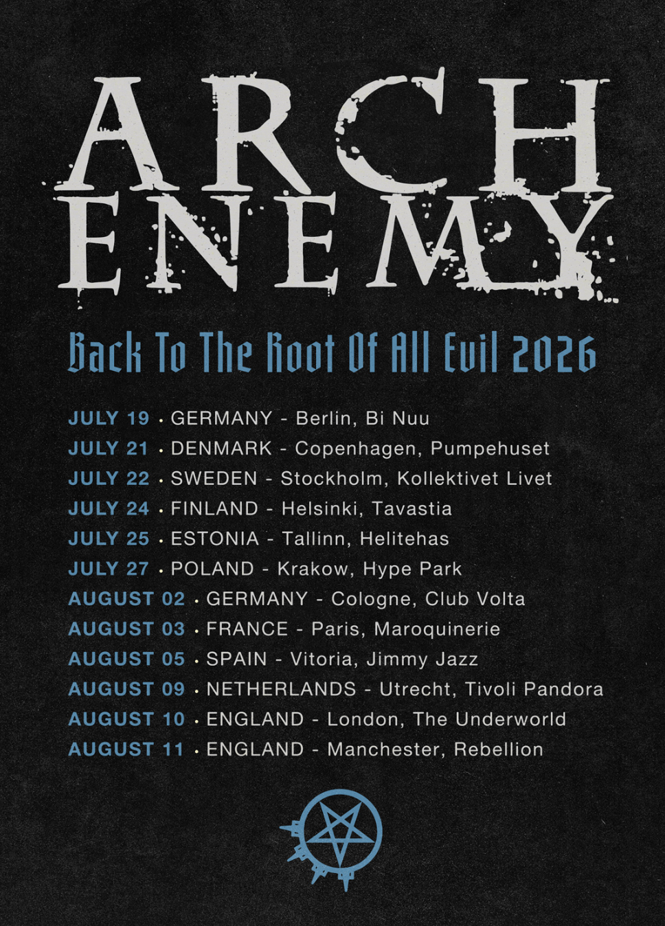 To celebrate this new chapter and present their unparalleled and raw band dynamic, Arch Enemy announce an intimate European club show run dubbed "Back To The Root Of All Evil" in Summer 2026.