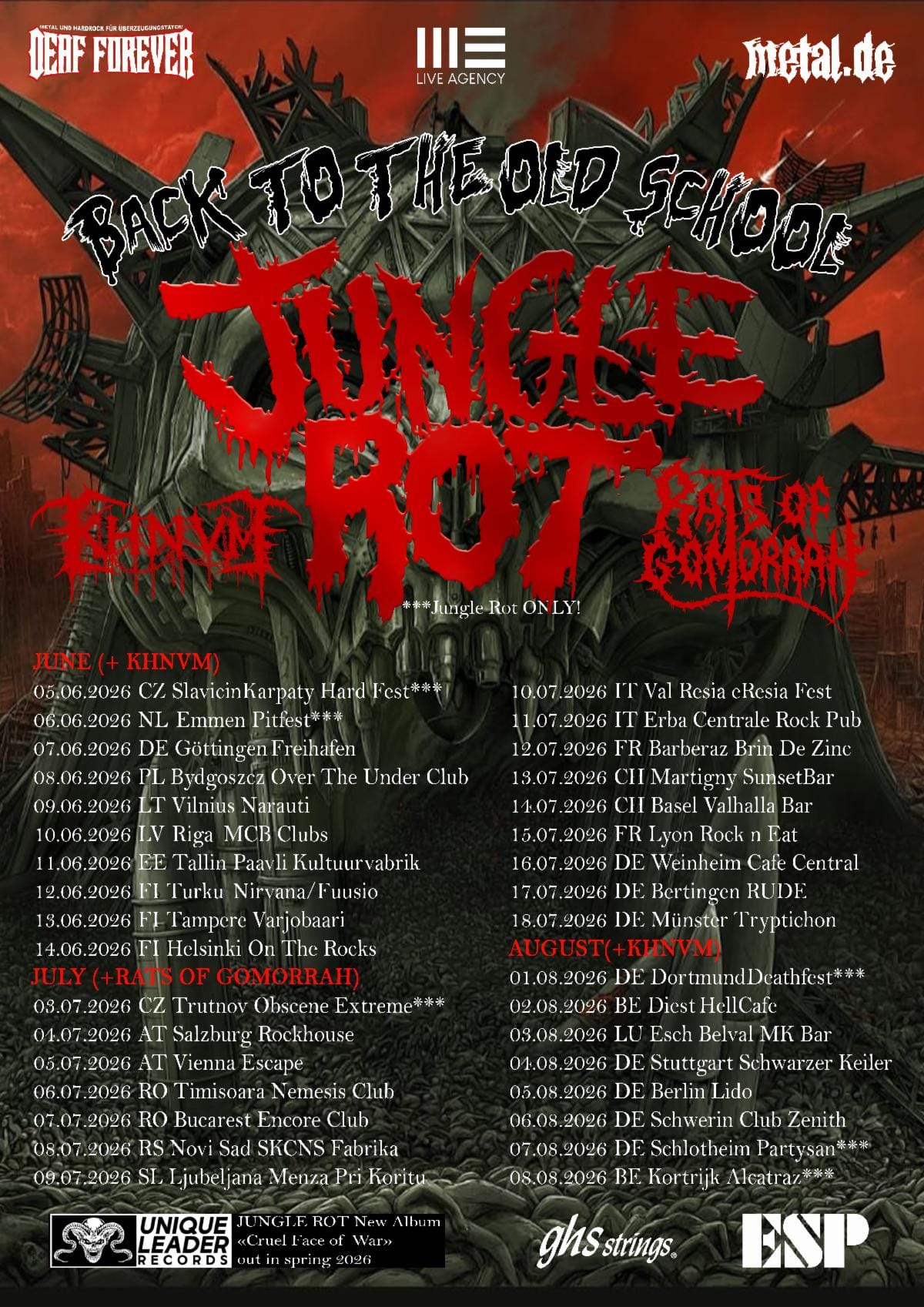 After Cruel Face Of War's release, Jungle Rot will appear across Europe this summer, headlining the "Back to the Old School Tour" with KHNVM and Rats Of Gomorrah as support, in addition to performing at some of the biggest festivals on the continent. See below for all dates!