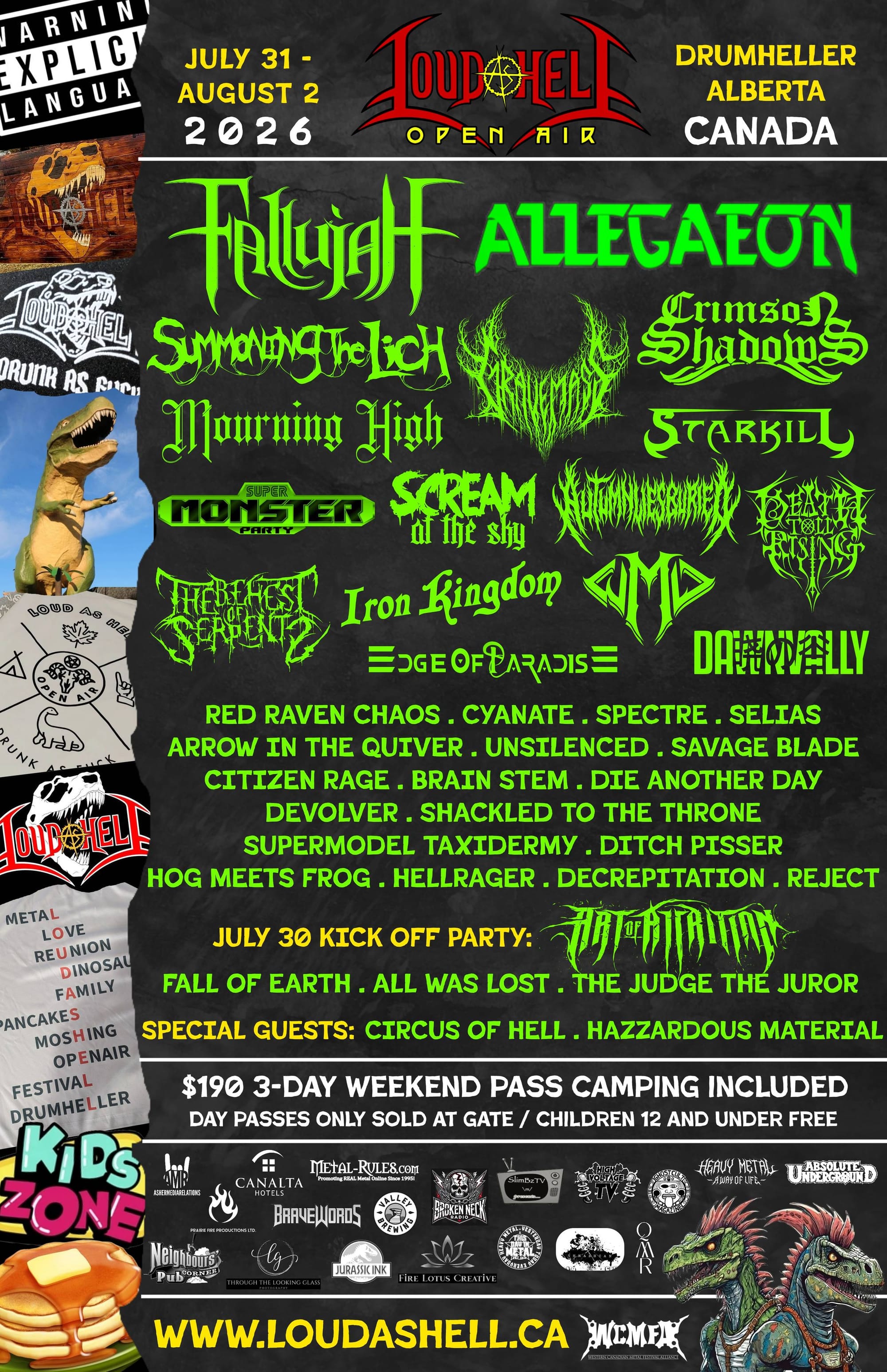 Renowned for unleashing one of Western Canada’s most punishing festival experiences, Loud As Hell Open Air Festival returns with another year of crushing performances, freak shows, burlesque acts, clinics, vendors, and, naturally, dinosaurs.