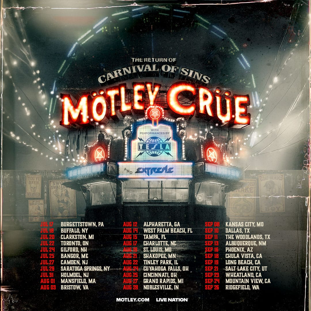The tour will hit 33 cities across North America, featuring a re-imagined production, a fully updated setlist, and special guest performances by rock legends Tesla and Extreme. Fans can expect a high-energy, modernized version of one of Mötley Crüe’s most explosive live tours.