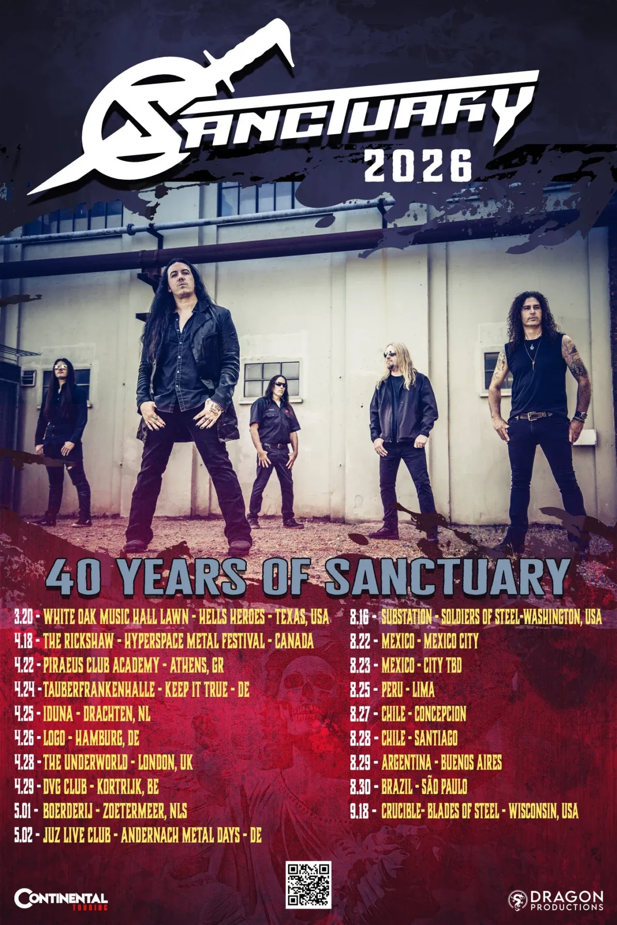 For the tour, Sanctuary has recruited guitarist Will Wallner (Neon Dragon, Ex-White Wizzard) on 2nd lead guitar. The tour will span North America, South America, and Europe, featuring special sets highlighting the band’s classic albums Refuge Denied and Into the Mirror Black, alongside fan favorites and new material, including “Not Of The Living.”