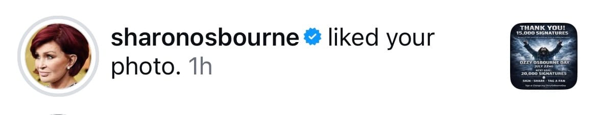 (Instagram screenshot showing Sharon Osbourne liking the Ozzy Osbourne Day campaign post)