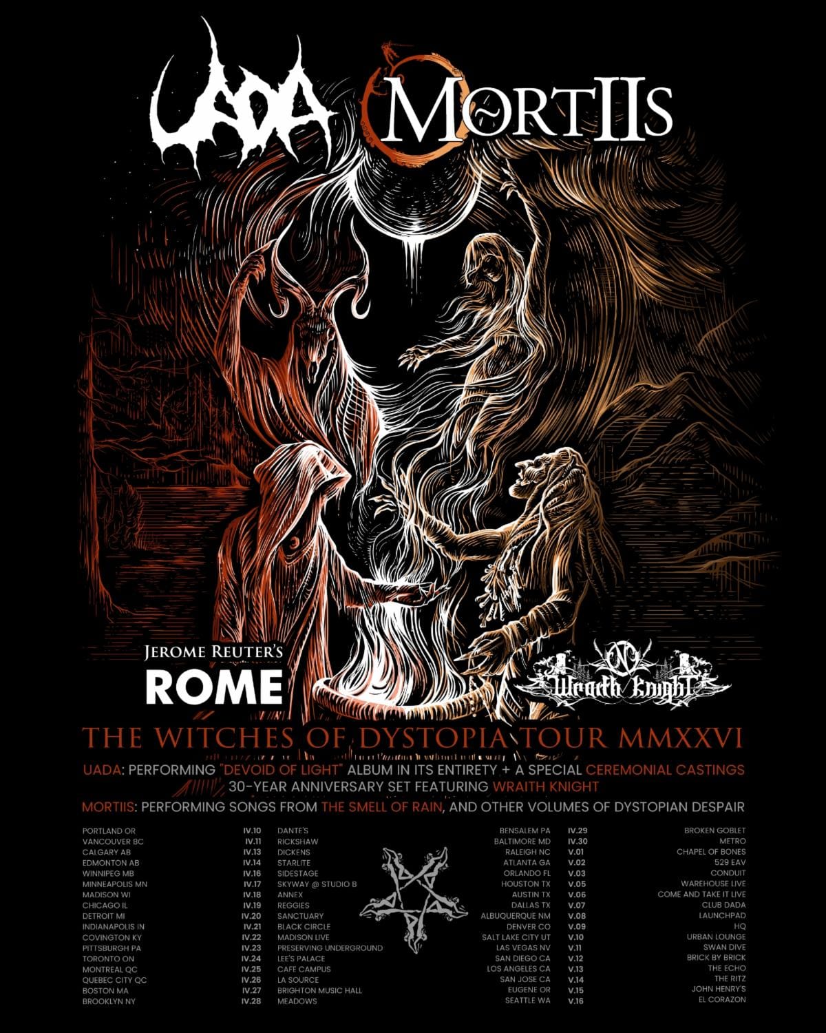 Enigmatic black metal horde UADA and industrial metal artist MORTIIS have teamed up for a very special co-headliner, featuring exclusive anniversary sets and supporting performances by Jerome Reuter’s ROME and WRAITH KNIGHT. UADA will be performing their seminal 2016 debut album 'Devoid of Light' in its entirety + a special CERMONIAL CASTINGS 30-year anniversary set featuring Wraith Knight. In addition, MORTIIS shall be performing songs from his groundbreaking 2001 full-length, 'The Smell Of Rain,' along with other volumes of dystopian despair.